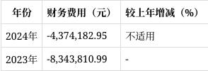 财务费用为-4,374,182.95元,2023年为-8,343,810.99元。主要原因是本年银行存款平均余额及利息收益率下降,导致财务费用的负数绝对值减小。虽然财务费用仍为负数,表明公司利息收入大于支出,但收益水平有所下降。