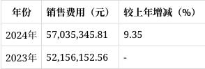 2024年销售费用为57,035,345.81元,较上年的52,156,152.56元增长9.35%。公司为争取更多市场机会,加大市场开拓力度,导致销售费用增加。这一增长反映了公司在竞争激烈的市场环境中积极寻求业务增长的策略,但也对利润产生了一定压力。