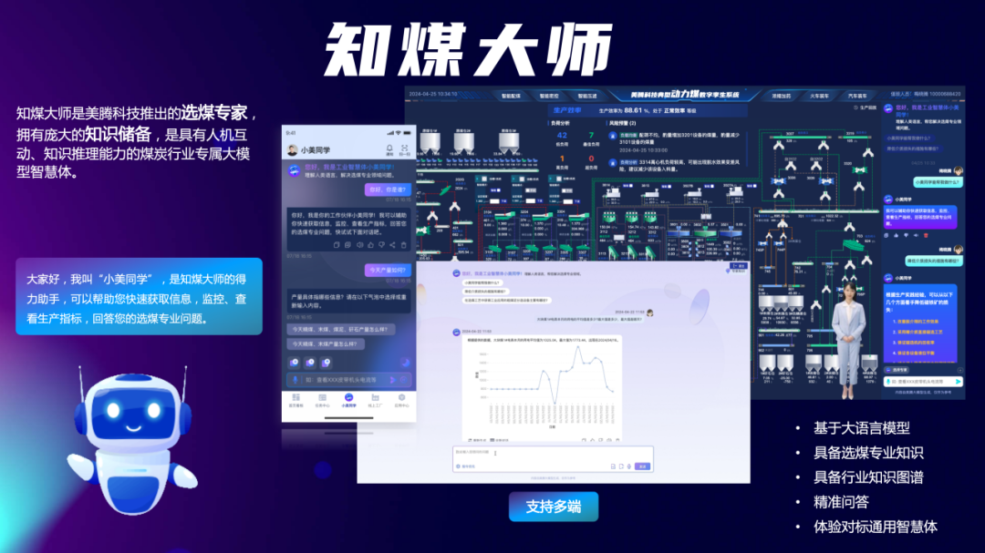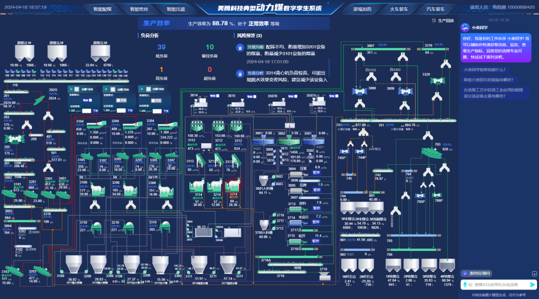 调研期间,知煤大师和数字孪生系统引起了调研团浓厚兴趣。知煤大师作为美腾科技自主研发的煤炭行业专属大模型,能够为选煤厂提供全方位的数据支持和优化建议。数字孪生系统则通过虚拟仿真技术,实时映射物理选煤厂的运行状态,实现生产过程的透明化管理和故障预警。
