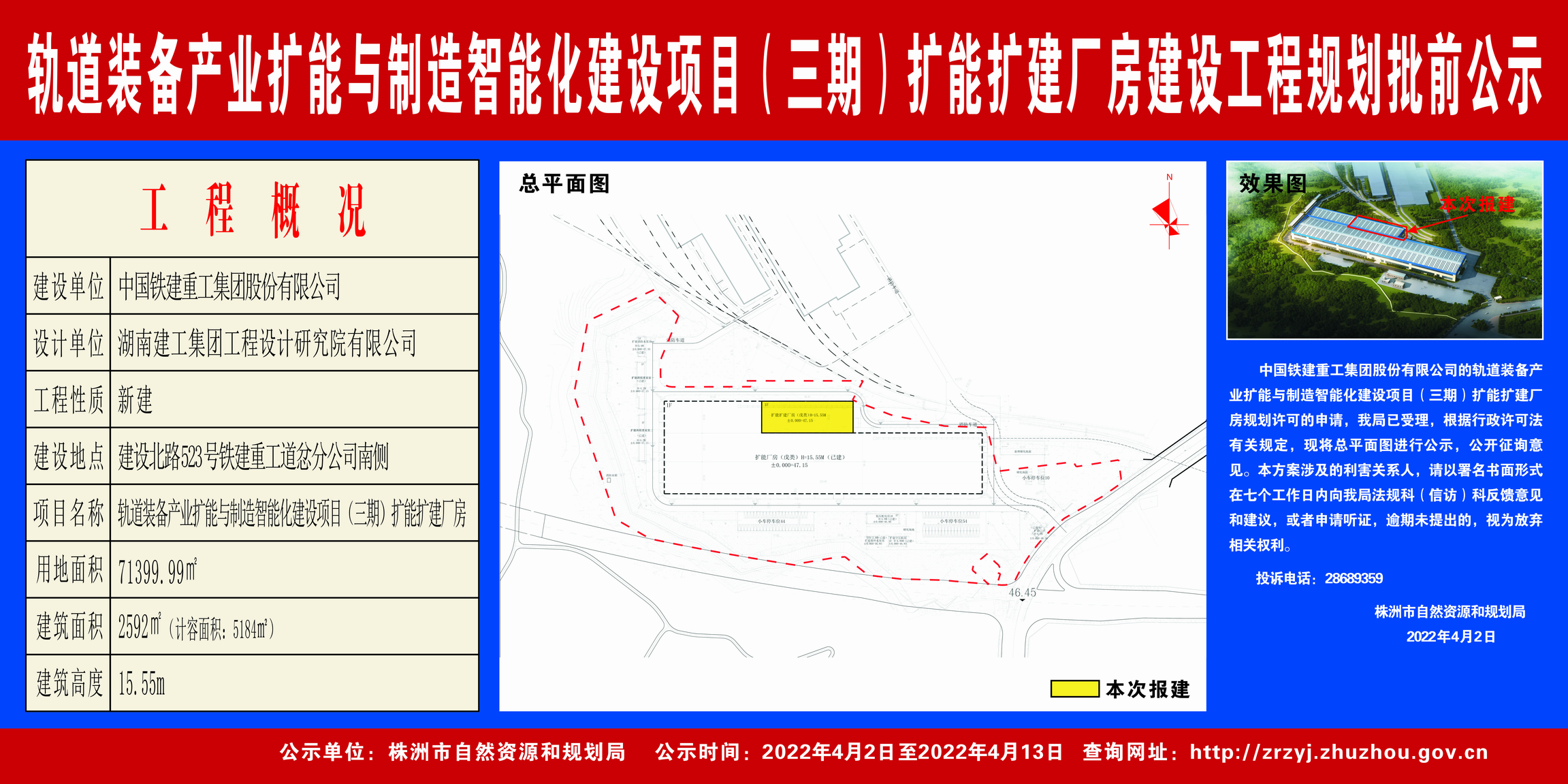 中国铁建重工集团股份有限公司(轨道装备产业扩能与制造智能化建设项目(三期)扩能扩建厂房建设工程规划批前公示)2