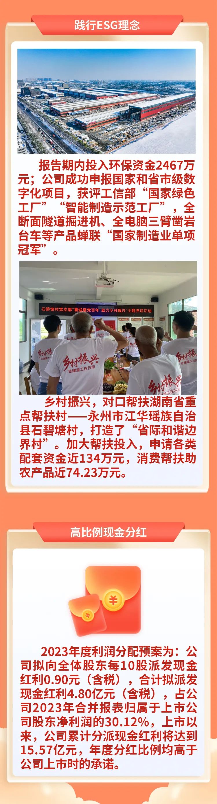 3月28日晚间,铁建重工披露2023年年度报告。报告期内,公司实现营业收入100.27亿元,实现归属于上市公司股东的净利润15.93亿元,基本每股收益0.30元,经营活动产生的现金流量净额7.04亿元。2023年,铁建重工优势产品核心竞争力提升、新兴市场机遇涌现、保持高强度研发投入、海外经营快速开拓、管理变革落地见效、价值创造能力显著提升、践行ESG理念,实施高比例的现金分红。