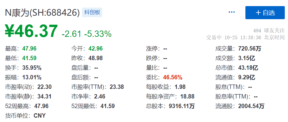 10月25日,分子检测试剂原料供应商康为世纪在上交所科创板上市。本次发行价格为48.98元/股,发行数量为2329.0278万股。遗憾的是,康为世纪新股开盘1秒破发,中间最高跌幅约15%。