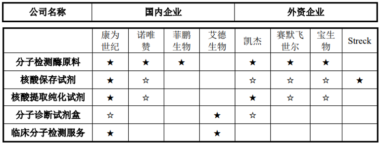 康为世纪表示,其主营业务遍布分子检测全产业链,已实现“核心酶原料+检测试剂盒+检测服务”的一体化布局,具体包括分子检测酶原料(包括逆转录酶、Taq酶、热启动Taq酶、高保真酶、等温扩增酶等)、核酸保存试剂、核酸提取纯化试剂、分子诊断试剂盒以及临床分子检测服务。