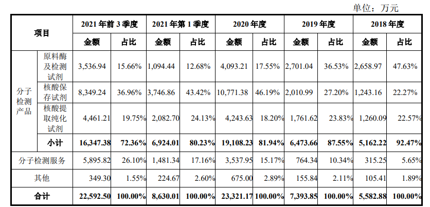 2019年,该公司主营收入不到0.74亿元;2020年暴涨215%,达到2.3亿元,新冠为其带来了超过一半的收入;2021年总体持续增长到3.3亿,新冠检测产品依旧占超一半,其中核酸保存试剂、核酸提取试剂是其新冠业务的主要产品,其他还有原料酶、检测服务等。