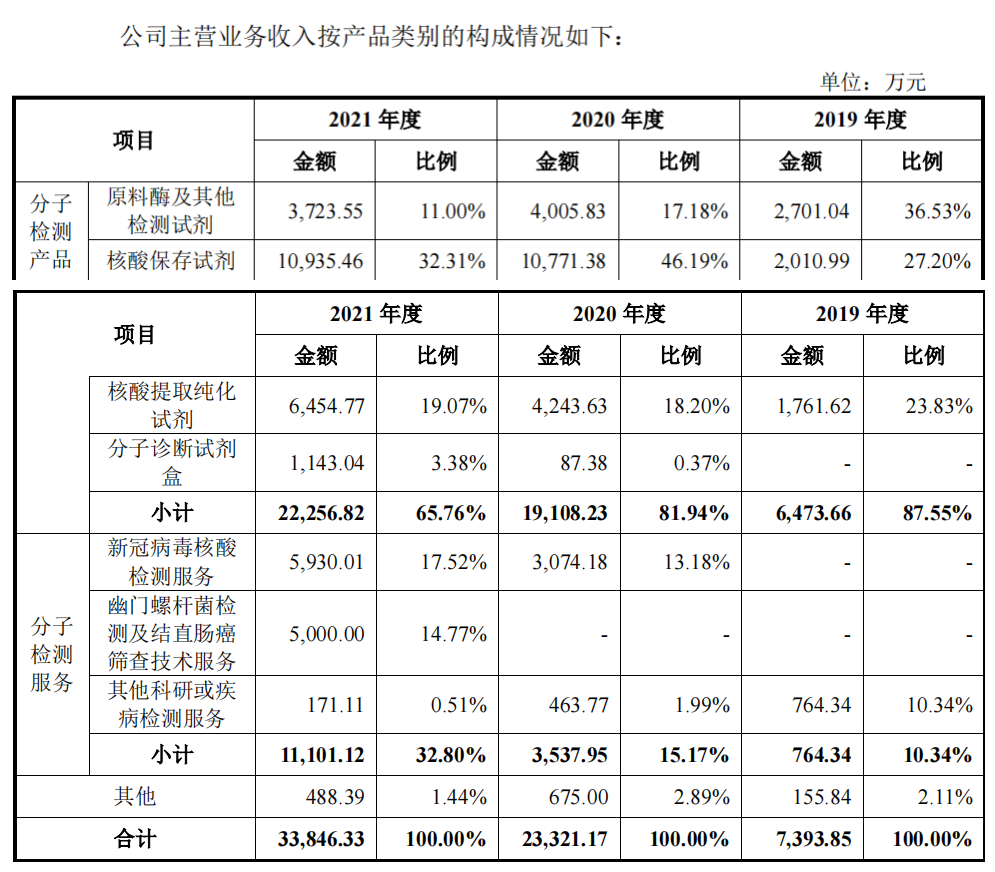 收入来源主要是其分子检测产品中的口腔样本核酸保存试剂和病毒样本磁珠法提取纯化试剂。这两者受新冠检测需求带动,2020年和2021年分别产生收入约1.1亿元和1.3亿元,占当期收入的比重为47.57%和37.99%。