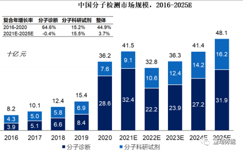 近年来国内分子检测行业发展迅速,2016 年至 2020 年,中国分子检测市场从 82.0 亿元增长至 361.7 亿元,复合年增长率为 44.9%;我国分级医疗系统的完善、科技创新和相关政策的支持将持续推动分子检测行业的发展,至 2025 年,中国分子检测市场规模将达到 480.7 亿元。