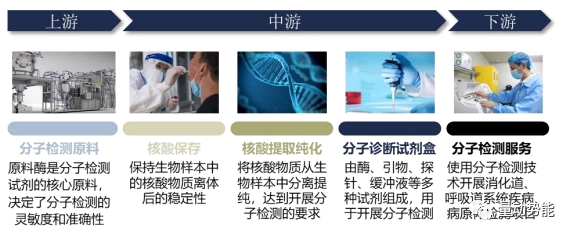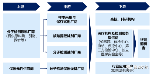 国内分子检测产业的上游为提供酶、引物、探针和底物的分子检测原料厂商和仪器元件供应商,中游为核酸样本保存试剂、核酸提取试剂、核酸检测试剂盒生产商和 PCR 仪、测序仪等设备生产商,下游是试剂和仪器的使用者,包括高校、科研机构、药企、CRO、医院、第三方医学实验室、血站、体检中心等。