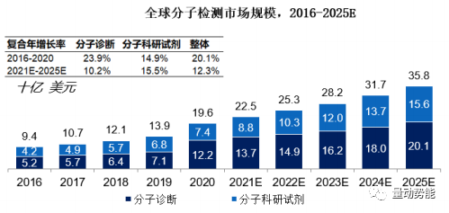 全球分子检测行业将持续发展,至 2025 年,全球分子检测市场规模将达到 357.8 亿美元,2021-2025 年的复合增长率将达 12.3%。