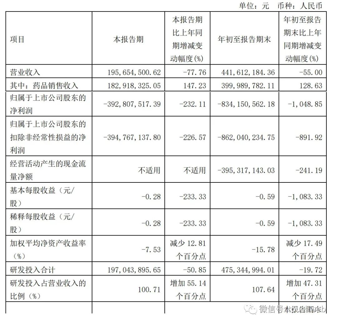 诺诚健华2022年第三季度营收为1.96亿元,较上年同期下降77.76%;归属于上市公司股东的净亏损为3.93亿元,扣非后净亏损为3.95亿元。