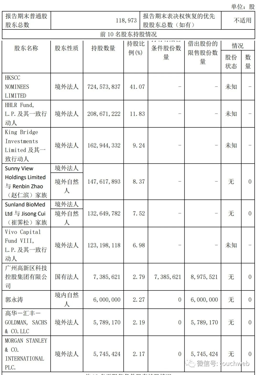 截至2022年9月30日,高瓴旗下HHLR Fund,L.P.及其一致行动人持股为11.83%,King Bridge Investments Limited 及其一致行动人持股9.24%,Sunny ViewHoldings Limited与 Renbin Zhao(赵仁滨)家族持股为8.37%,Sunland BioMedLtd 与 Jisong Cui(崔霁松)家族持股为7.52%;