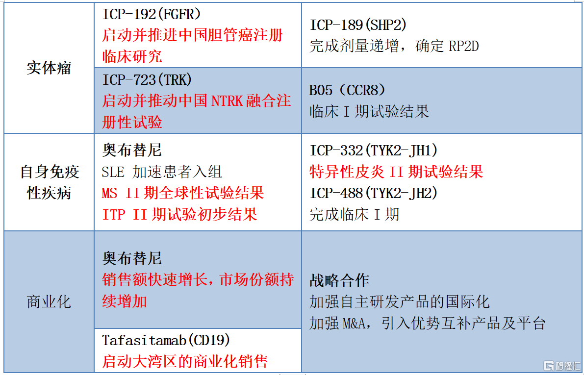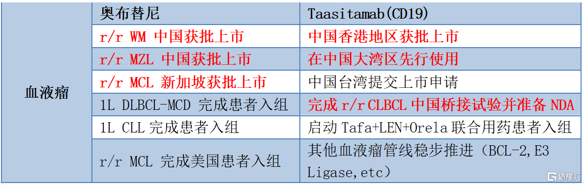 根据公司披露,未来一年内将有新扩展适应症以及新药进入商业化阶段,例如核心产品奥布替尼多项适应症在中国以及新加坡拿到上市批文(包括r/r WM、r/r MZL以及r/r MCL);在BD引进一年后的Tafasitamab也将在中国香港获批上市,在中国台湾提交上市,在中国大湾区先行开启商业化。此外,公司在实体瘤、自身免疫性疾病领域更是将拿到一系列关键性临床试验数据结果,创新研发硕果频现。