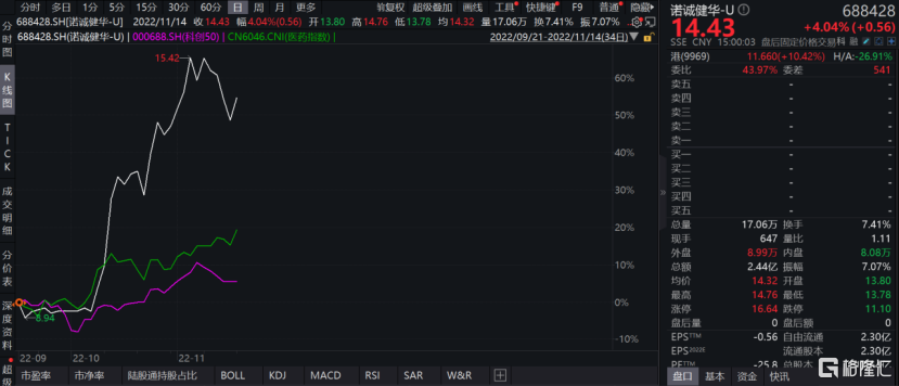 备注:白线:诺诚健华紫线:科创50指数,绿线:医药指数