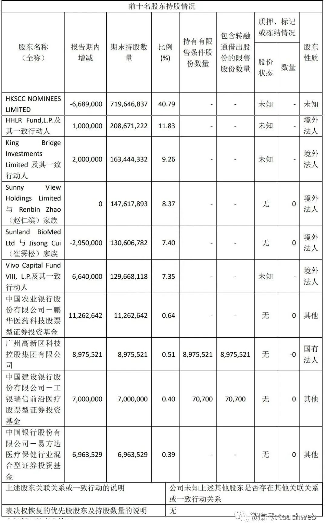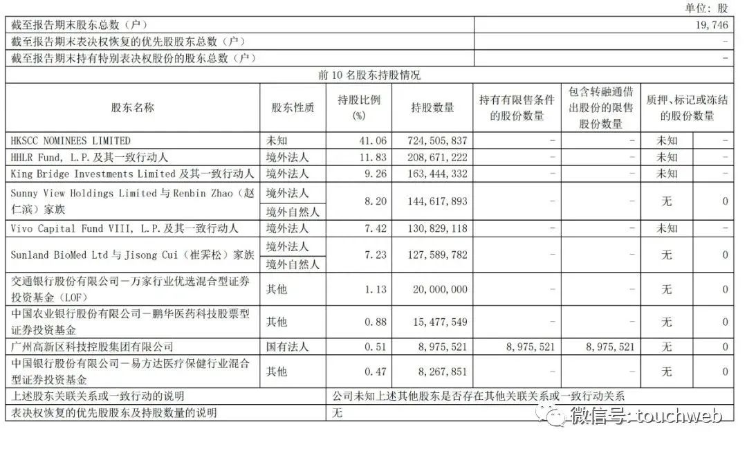 截至2022年12月31日,高瓴旗下HHLR及其一致行动人持股为11.83%,King Bridge Investments Limited 及其一致行动人持股9.26%,Sunny ViewHoldings Limited与 Renbin Zhao(赵仁滨)家族持股为8.37%,Sunland BioMedLtd 与 Jisong Cui(崔霁松)家族持股为7.4%;
