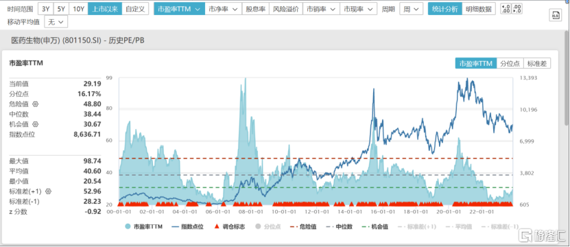 数据显示,在过往二十多年以来,医药生物指数表现虽有曲折但整体趋势向上。从PE(TTM)的维度来看,在经历过2020年医药板块大行情后,整体估值泡沫已被清干,在2022年底缓慢回升,并在今年8月底以来随着相关影响逐步减弱,估值开始小幅上涨。截止到2023年11月14日,医药行业市盈率约为29.19倍,处于过往二十年以来的16.17%分位点,依旧低于机会值30.67倍,向上增长空间仍大。