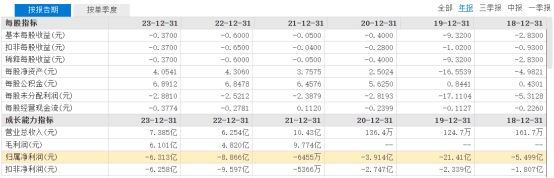 2023年,公司实现营业收入7.39亿元,同比增长18.09%;归属于上市公司股东的净利润-6.31亿元,2022年同期为-8.87亿元;归属于上市公司股东的扣除非经常性损益的净利润-6.26亿元,2022年同期为-9.60亿元;经营活动产生的现金流量净额为-6.65亿元,2022年同期为-4.91亿元。