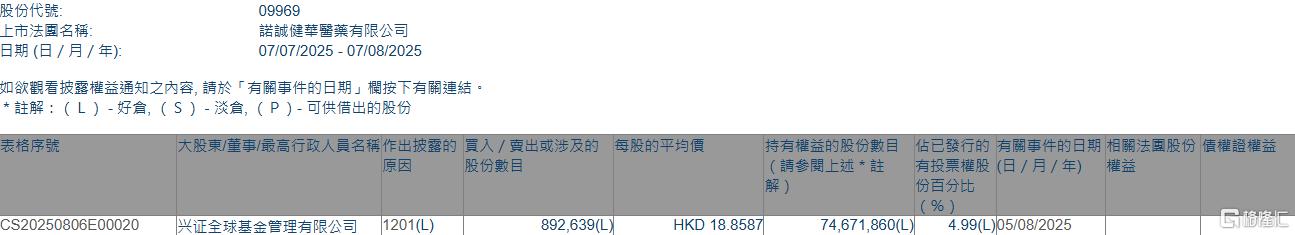 根据联交所最新权益披露资料显示,2025年8月5日,诺诚健华(09969.HK)遭兴证全球基金管理有限公司在场内以每股均价18.8587港元减持89.26万股,涉资约1683.40万港元。