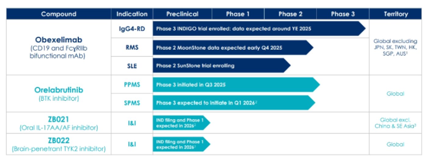 Zenas当前管线中,有一款处于临床Ⅲ期的双功能单克隆抗体Obexelimab,于9月获得英国上市公司Royalty Pharma 3亿美元新药融资,其中首付款7500万美元用于资助Obexelimab治疗IgG4相关性疾病在美国潜在的商业上市,另1.5亿美元与该药物INDIGO三期试验成果及FDA批准相关。在战略布局上,Obexelimab能与奥布替尼在自身免疫疾病领域形成管线互补。