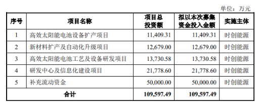 6月26日时创能源披露的招股说明书显示,本次上市,公司拟募集资金109,597.49万元,用于高效太阳能电池设备扩产项目、新材料扩产及自动化升级项目、高效太阳能电池工艺及设备研发项目、研发中心及信息化建设项目、补充流动资金。
