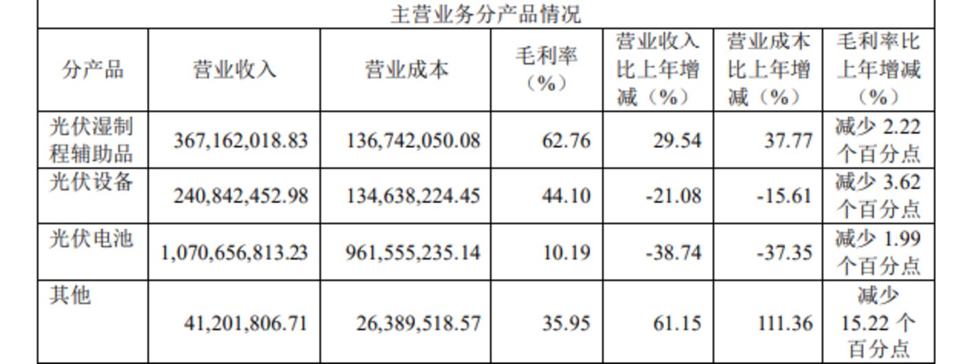 相比之下,光伏湿制程辅助品表现亮眼,当期实现主营业务收入3.67亿元,同比增长29.54%。