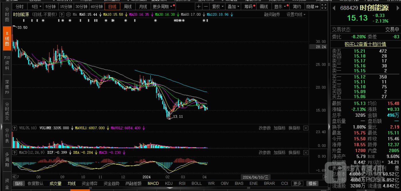 时创能源今年2月6日创下13.11元的低点后有所反弹,但目前仍处于低位。截至4月10日上午收盘,时创能源报15.09元,跌幅为2.39%,这一价格较历史高点已“腰斩”。
