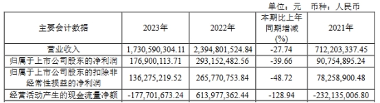2023年,公司实现营业收入17.31亿元,同比下降27.74%;归母净利润1.77亿元,同比下降39.66%;扣非净利润1.36亿元,同比下降48.72%;经营活动产生的现金流量净额为-1.78亿元,上年同期为6.14亿元。
