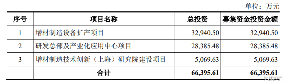 本次IPO拟募资6.64亿元,主要用于增材制造设备扩产项目、研发总部及产业化应用中心项目、增材制造技术创新(上海)研究院建设项目。