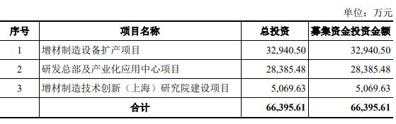 华曙高科最终募集资金净额比原计划多35937.83万元。华曙高科于2023年4月11日发布的招股说明书公司显示,公司拟募集资金66,395.61万元,用于增材制造设备扩产项目、研发总部及产业化应用中心项目、增材制造技术创新(上海)研究院建设项目。
