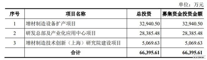 公司发行价格26.66元/股,发行市盈率为154.83倍。本次公开发行股票共募资11亿元,几乎是原募资计划6.64亿元的两倍。主要用于增材制造设备扩产项目、研发总部及产业化应用中心项目、增材制造技术创新(上海)研究院建设项目。