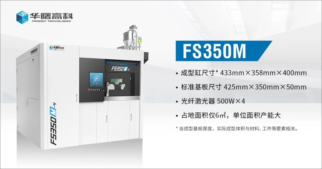 FS350M标准基板尺寸为425×350×50mm,标配4个激光器,具备同级别产品领先的激光器配置,确保高效生产,可打印钛合金、铝合金、模具钢、不锈钢等多种材料。