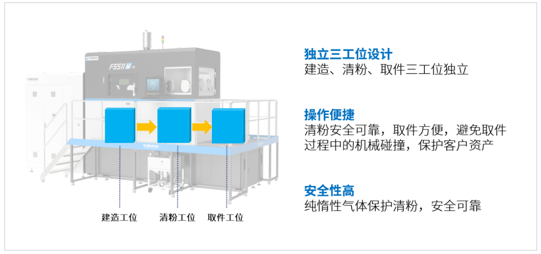 大尺寸成型缸的转运效率和安全性是一大挑战,得益于华曙高科雄厚的自主研发能力,FS511M配备华曙自主研发的缸体“建造”、“清粉”及“取件”独立三工位,并拥有“一键转移”功能,取件方便,减少人工操作,避免取件过程中的机械碰撞,保护客户资产。