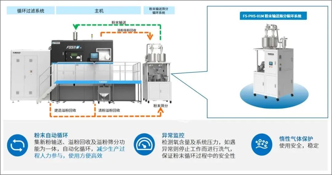 FS511M配备了华曙高科自主研发自动粉末循环增材系统,集新粉输送、溢粉回收及溢粉筛分功能为一体,能实现惰性气体保护下100%全闭环粉末管理,清粉效率高,安全可靠。