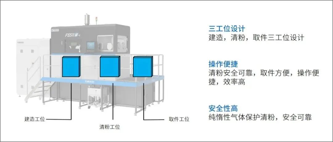 在批量生产中,大尺寸成型缸的转运效率和安全性是一大挑战。得益于华曙高科雄厚的自主研发能力,FS511M配备华曙自主研发的缸体“建造”、“清粉”及“取件”独立三工位,并拥有“一键转移”功能,取件方便,减少人工操作,避免取件过程中的机械碰撞,保护客户资产。惰性气体全程保护,保障清粉安全。