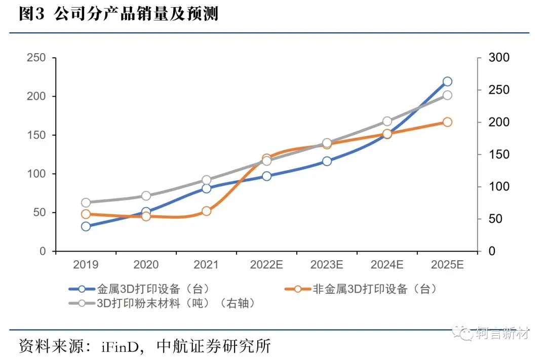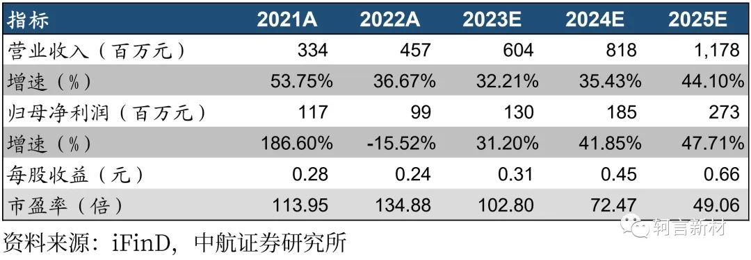 公司作为多元化、国际化的增材制造设备制造商,报告期内取得了较快增长,随着公司在航空航天、医疗、汽车、模具以及消费电子等领域的不断突破,公司业绩将保持较快增速。我们预计公司2023-2025年实现营业收入6.0亿元、8.2亿元、11.8亿元,同比增长32.2%、35.4%、44.1%,实现归母净利润1.3亿元、1.9亿元、2.7亿元,同比增长31.2%、41.9%、47.7%,对应PE 103X、72X、49X,给予“买入”评级。
