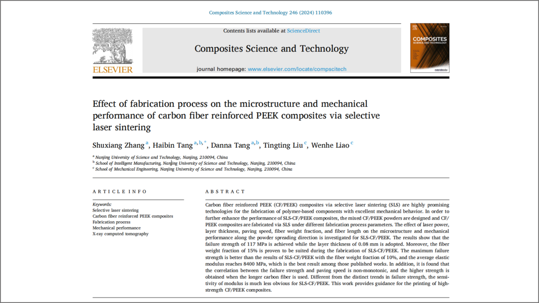 相关成果以论文《Effect of fabrication process on the microstructure and mechanical performance of carbon fiber reinforced PEEK composites via selective laser sintering》为题,发表于国际著名期刊《Composites Science and Technology 246 (2024) 110396》(影响因子9.1,https://doi.org/10.1016/j.compscitech.2023.110396),署名作者为Shuxiang Zhang, Haibin Tang, Danna Tang, Tingting Liu, Wenhe Liao。