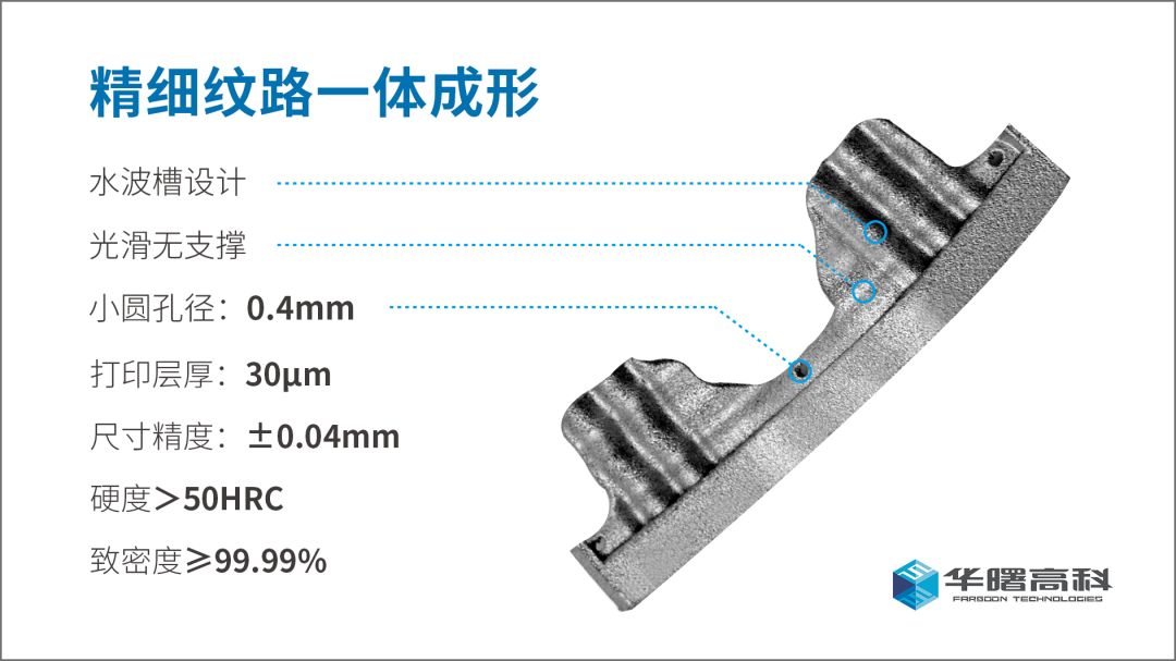 华曙高科金属3D打印解决方案,可一体成形整块复杂花纹模具钢片,细节高度还原。满版可打印1000-3000件,其尺寸精度达±0.04mm,致密度超99.9%,硬度超50HRC,且同一批次的生产可以打印多种尺寸、形状的花纹钢片,加速产品设计迭代,真正实现个性化定制与稳定批量生产相结合。