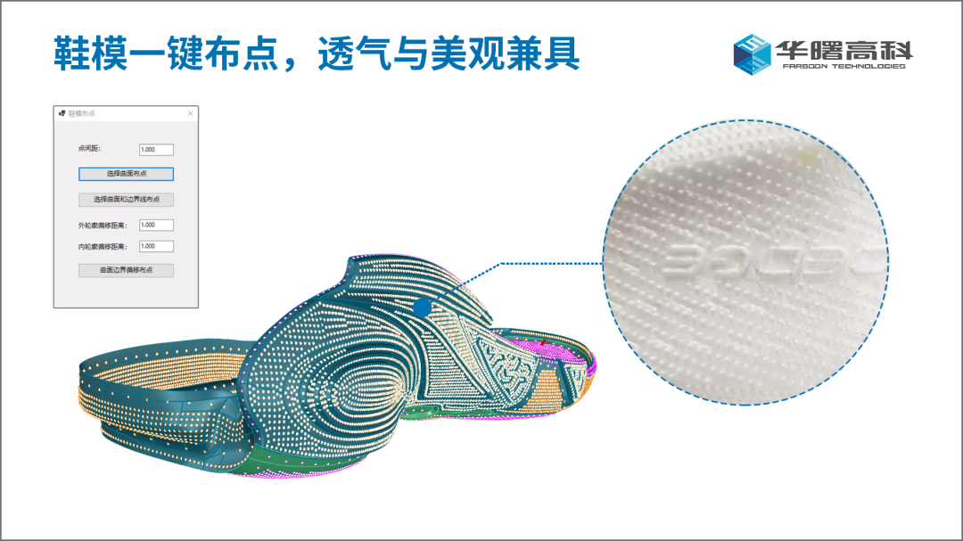 华曙高科于2024年5月发布专为鞋模用户开发的鞋模选区布点技术。用户可根据鞋模不同曲面的特征,自动计算合理的布孔点位,也可以自定义规则来对不同类型的曲面,形成个性化或均匀性的布孔分布效果,在满足透气需求的同时生成美观图案,打孔效率提高25%。