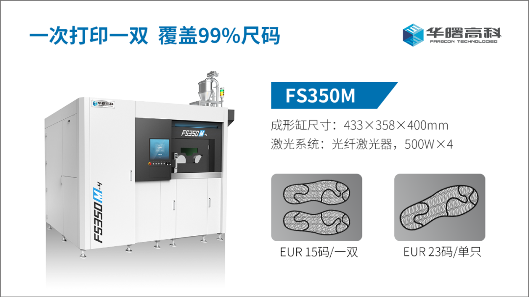 以FS350M系列为例,其不仅适用于航空航天、汽车、医疗、模具等行业产业化应用,在鞋模行业也极具效率、产能优势。该设备成形缸经过特别设计,尺寸为433×358×400mm(含成形基板厚度),一次可打印一双鞋模,覆盖市面上99%鞋模尺码;标配4激光,扫描速度最高10m/s,采用稳定成熟双向铺粉技术;充气效率高,时间仅需11分钟,加工时耗气量仅为3-5 L/min,远低于行业均值;多层风场设计,保证风场均匀性,打印品质优异。