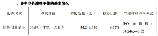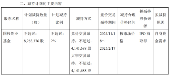 因股东自身资金需求,国投创业基金计划拟自公告披露之日起十五个交易日后的三个月内,通过集中竞价交易和大宗交易的方式合计减持其所持有的公司股份合计不超过8,283,376股,拟减持股份数量占公司总股本的比例合计不超过2%。其中,通过集中竞价交易方式减持不超过4,141,688股,占公司总股本比例不超过1%;通过大宗交易方式减持不超过4,141,688股,占公司总股本比例不超过1%。上述股份减持价格按减持实施时的市场价格确定。