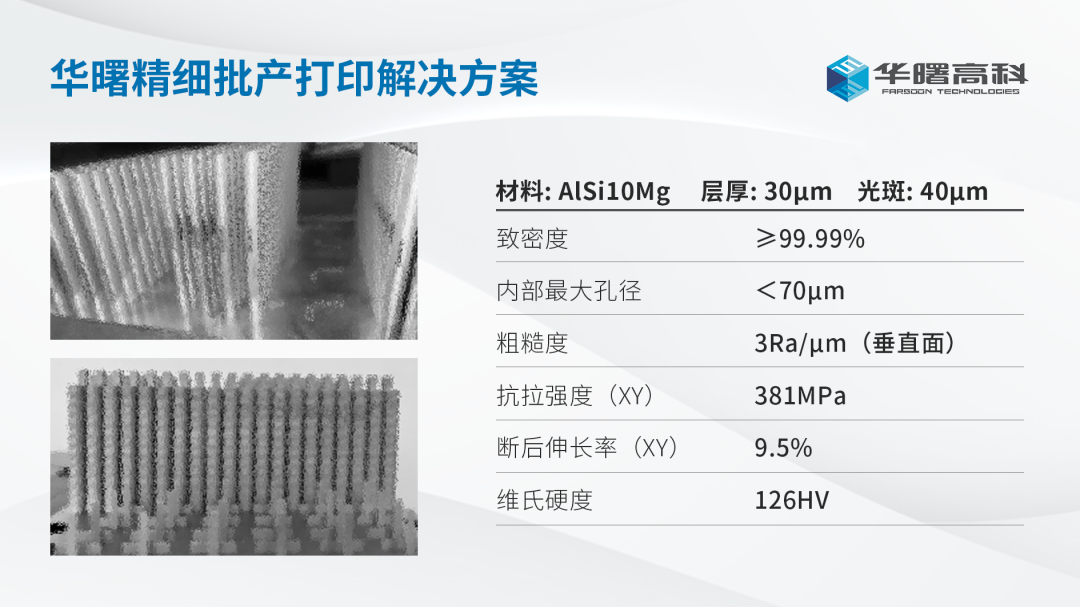 华曙高科面向批量生产用户优化升级的金属设备FS200M,其打印精度、效率、稳定性均经严格测试验证,旨在从成形工艺、成形质量等多方面提高产品市场竞争力,为用户赋能。以铝合金为例,采用40μm精细光斑、30μm层厚工艺打印的工件致密度达99.99%。