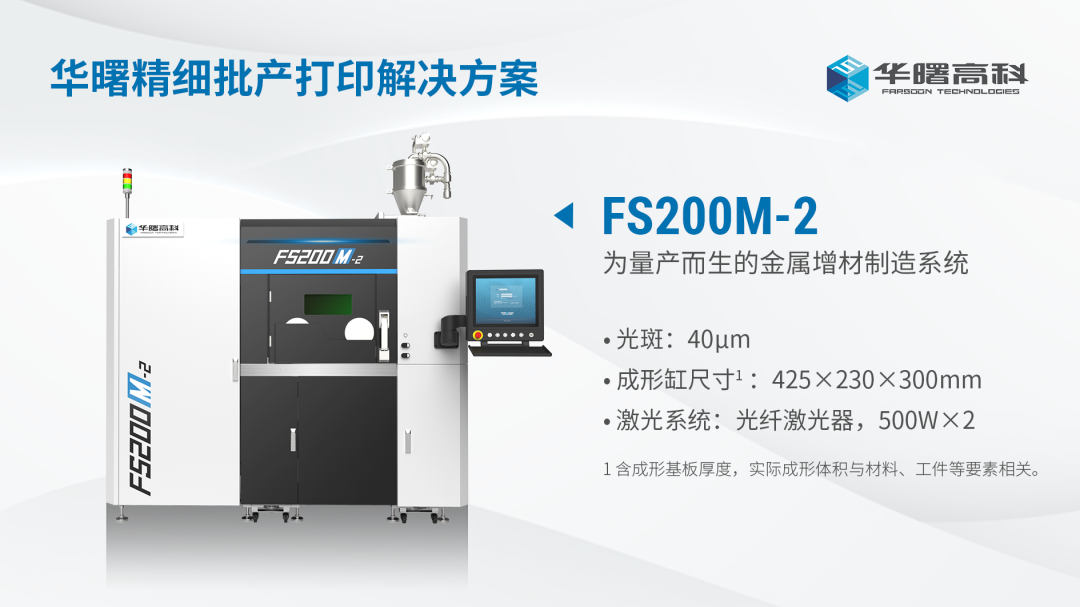 2022年,华曙高科发布面向批量生产用户金属增材制造双激光设备FS200M,目前已经汽车、航空航天、模具、消费品等领域多种产业化生产场景的应用考验,其打印质量、效率、稳定性均受到各行业用户认可。