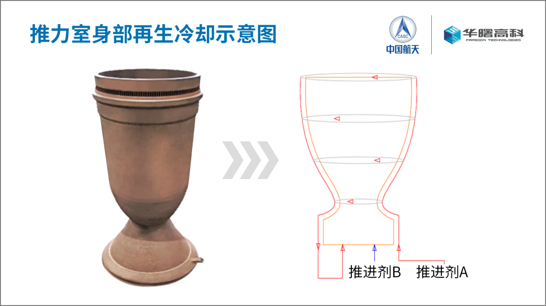 推力室是液体火箭发动机的核心,在极端温度、压力、振动和氧化环境下运行,是液体火箭发动机中最复杂、制造难度最大、制造周期最长的部件。推力室通常采用夹层流道设计,利用再生冷却方法,在发动机工作循环中使用推进剂来整体冷却推力室侧壁,同时又可保持足够的壁温来加热推进剂,从而提高喷注效果。