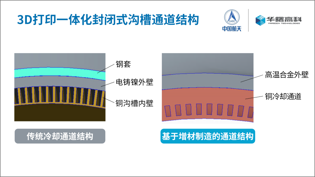 采用增材制造方法可大大简化推力室身部的制造过程,实现铜合金内衬封闭式沟槽通道结构一体成形,达到优化冷却通道几何结构,增强换热性能,提高发动机整体性能的效果。相比传统旋压+机加+钎焊方案,这种制造成本降低75%,并大幅缩短研发周期。