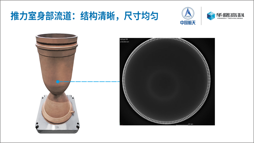 为确保火箭发动机推力室身部槽道结构尺寸精度,提高一次打印成功率,首都航天机械有限公司截取零件典型局部进行打印验证,并对槽道进行抛光处理,减少压降,提高发动机性能,经验证后最终成功打印出推力室整体零件。对推力室身部流道结构进行X光扫描,可以看出其流道特征结构清晰、尺寸均匀,粉末清理彻底,成品品质优异。