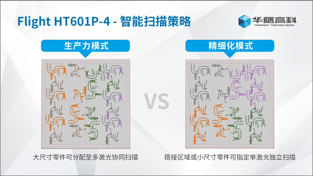 该系统提供了两种扫描策略:生产力模式和精细化模式。生产力模式适用于超大尺寸工件的打印,四激光会自动分配任务以确保高效打印;而精细化模式则适用于尺寸小于335×550mm的工件,采用单激光扫描以确保工件的精细度。