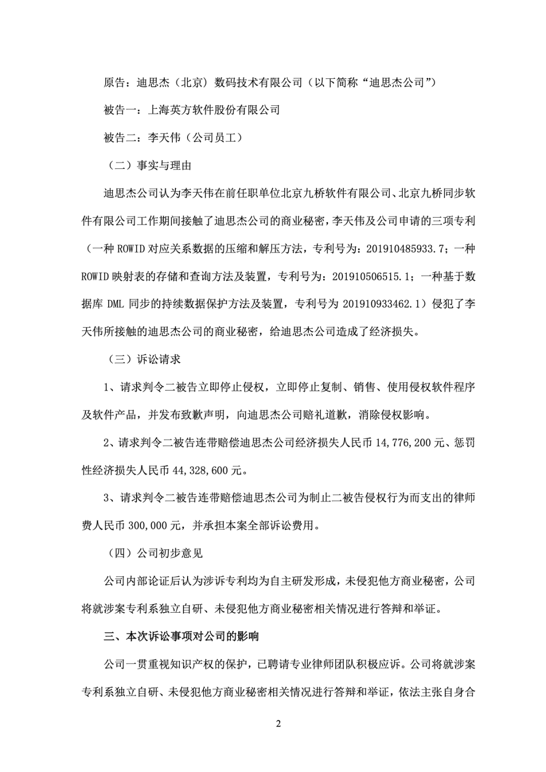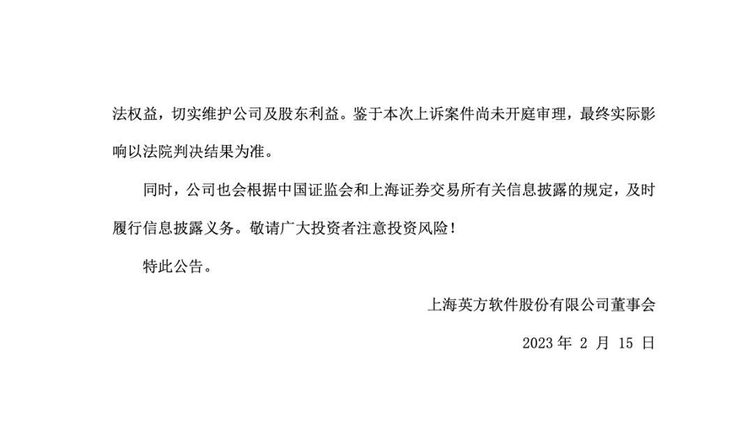 2023年2月14日,英方软件发布《涉及诉讼》的公告。