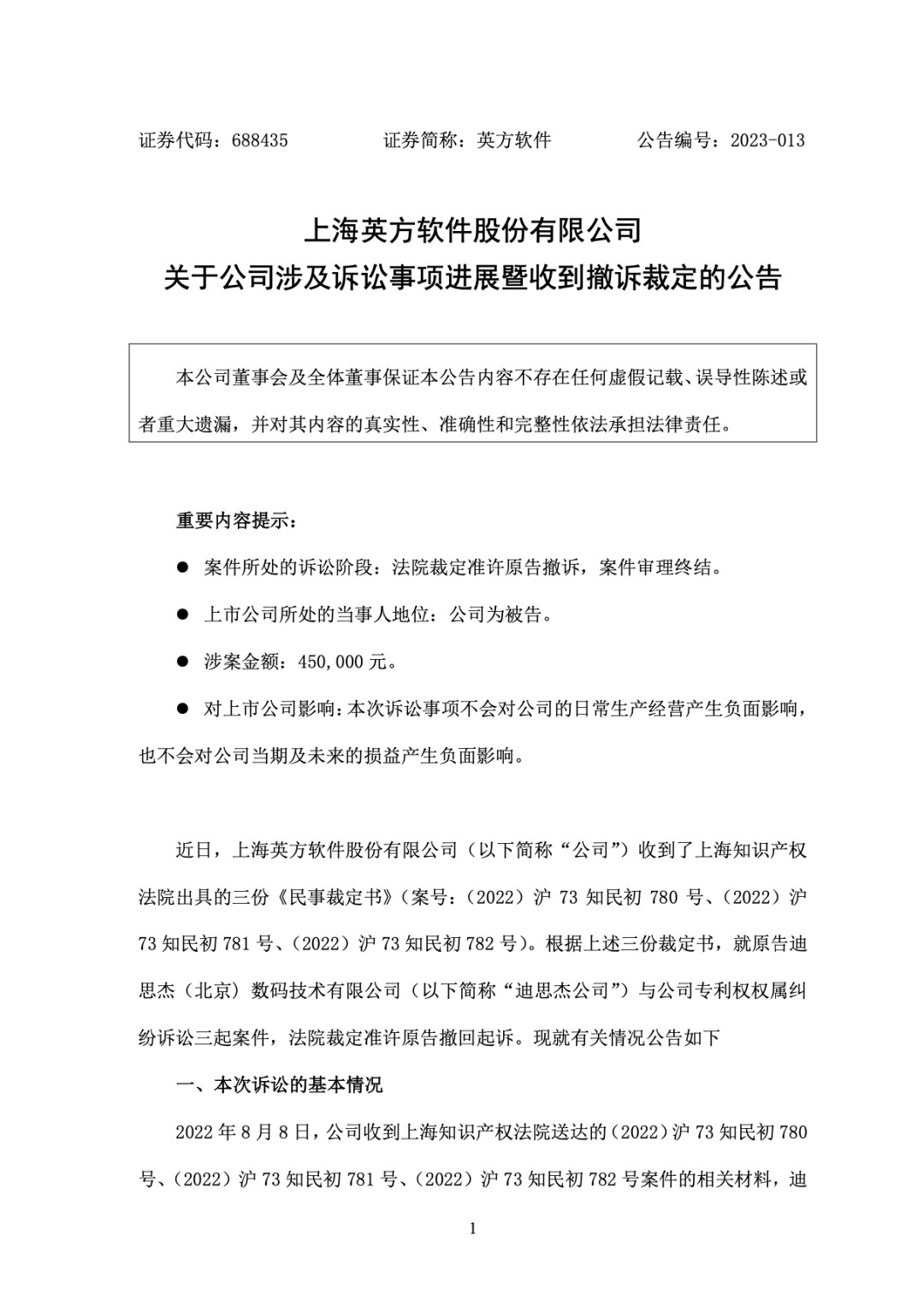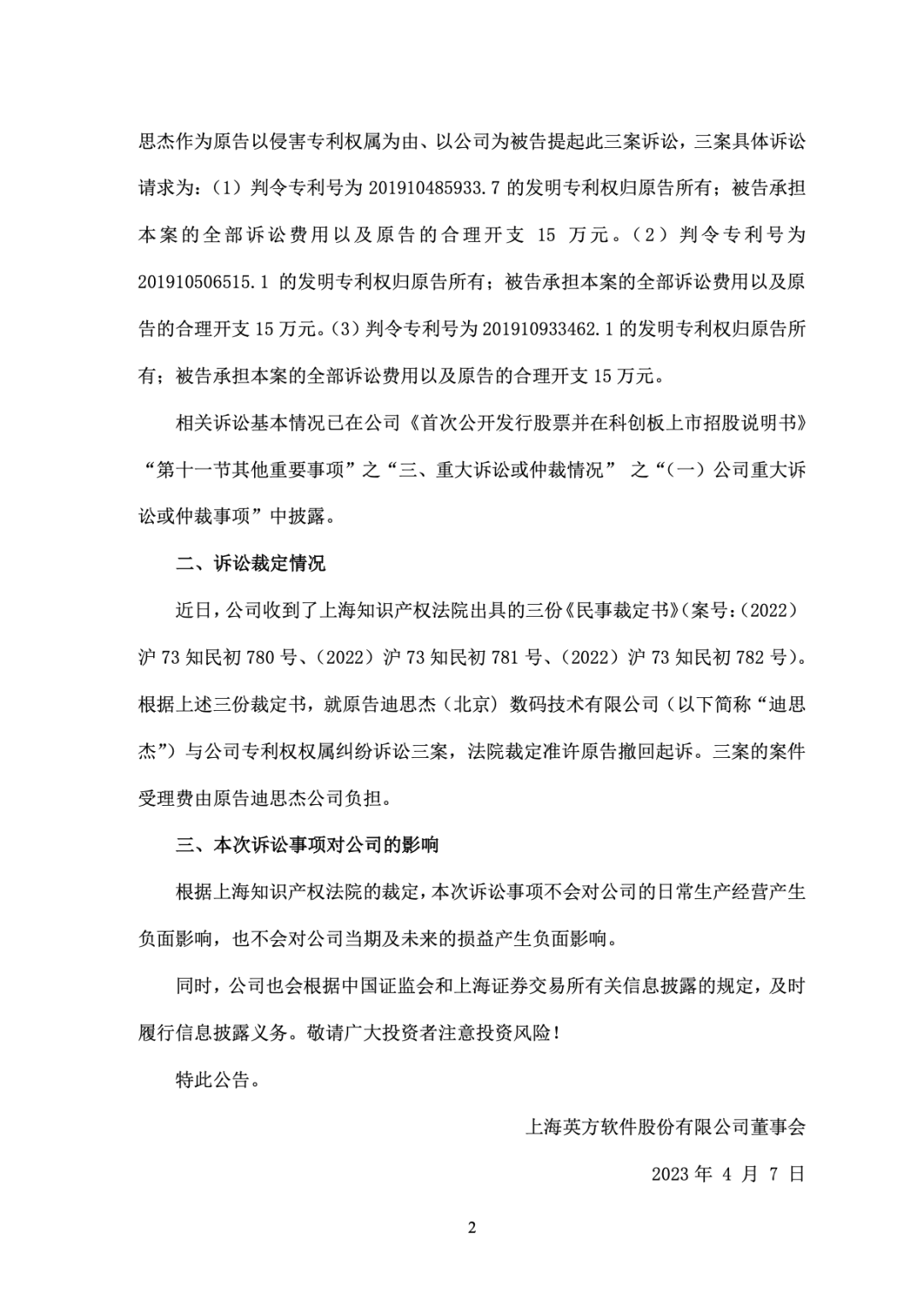 2023年4月6日,英方软件发布《关于公司涉及诉讼事项进展暨收到撤诉裁定的公告》。