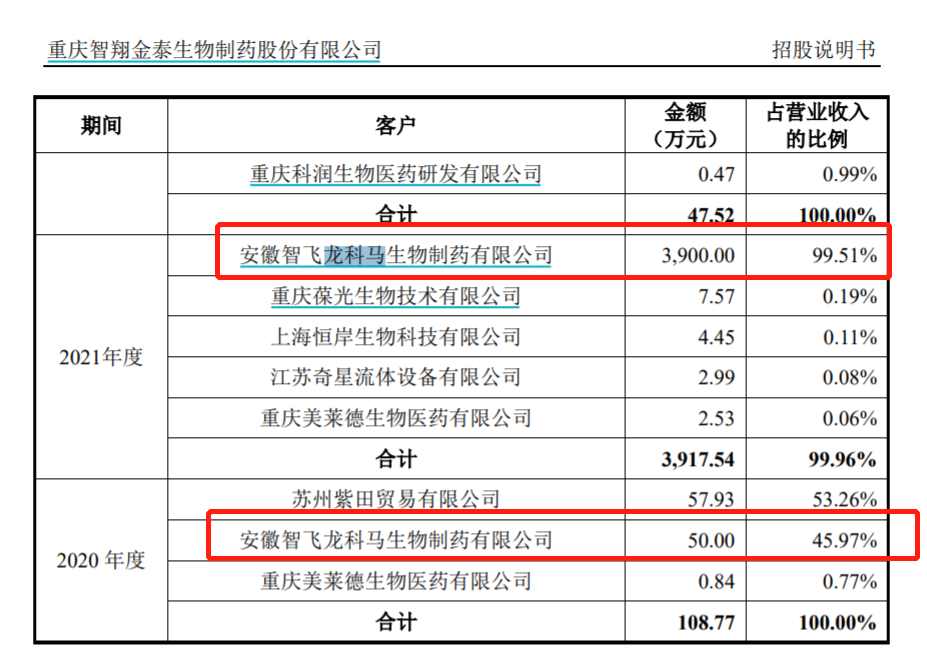 除了实控人与智飞生物的关联,智翔金泰的客户也依赖智飞系企业。招股书显示,2020年和2021年,智飞生物全资子公司智飞龙科马位列智翔金泰第二大客户和第一大客户,销售额分别为50万元、3900万元,占营收的比重分别为45.97%、99.51%。智翔金泰强调,报告期内客户数量较少,客户集中度较高,具有合理性。