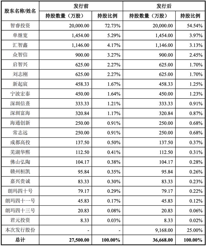 此外,单继宽持股5.29%,汇智鑫持股4.17%,众智信持股3.27%,启智兴持股2.27%,刘志刚持股2.27%,新起宸持股1.67%,宁波宏泰持股1.64%,深圳信熹持股1.21%,深圳富海持股1.17%,海通创新持股0.91%,常志远持股0.91%。