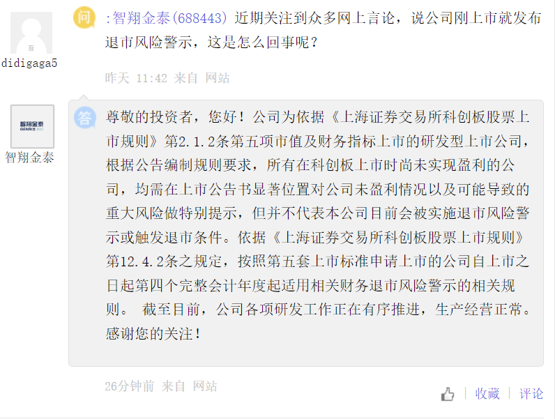据“上证e互动”消息,昨日午间,有投资者表示,近期关注到众多网上言论,称公司刚上市即发布退市风险警示,并问及事件详情。中国网财经记者注意到,今日早间,智翔金泰回应上述提问。