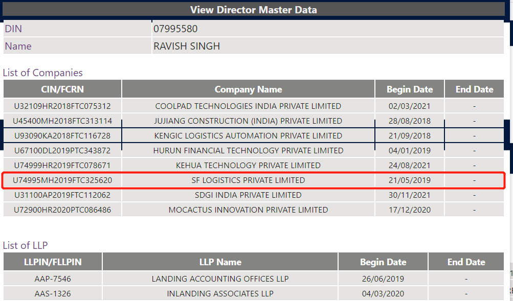 据印度公司事务部的公开信息,自2019年5月21日起,Ravish Singh开始在SF logistics private limited(以下简称“印度顺丰”)任职。截至查询日期2022年1月4日,未有离任信息。而截至查询日期2022年8月2日,Ravish Singh已不在印度顺丰任职。
